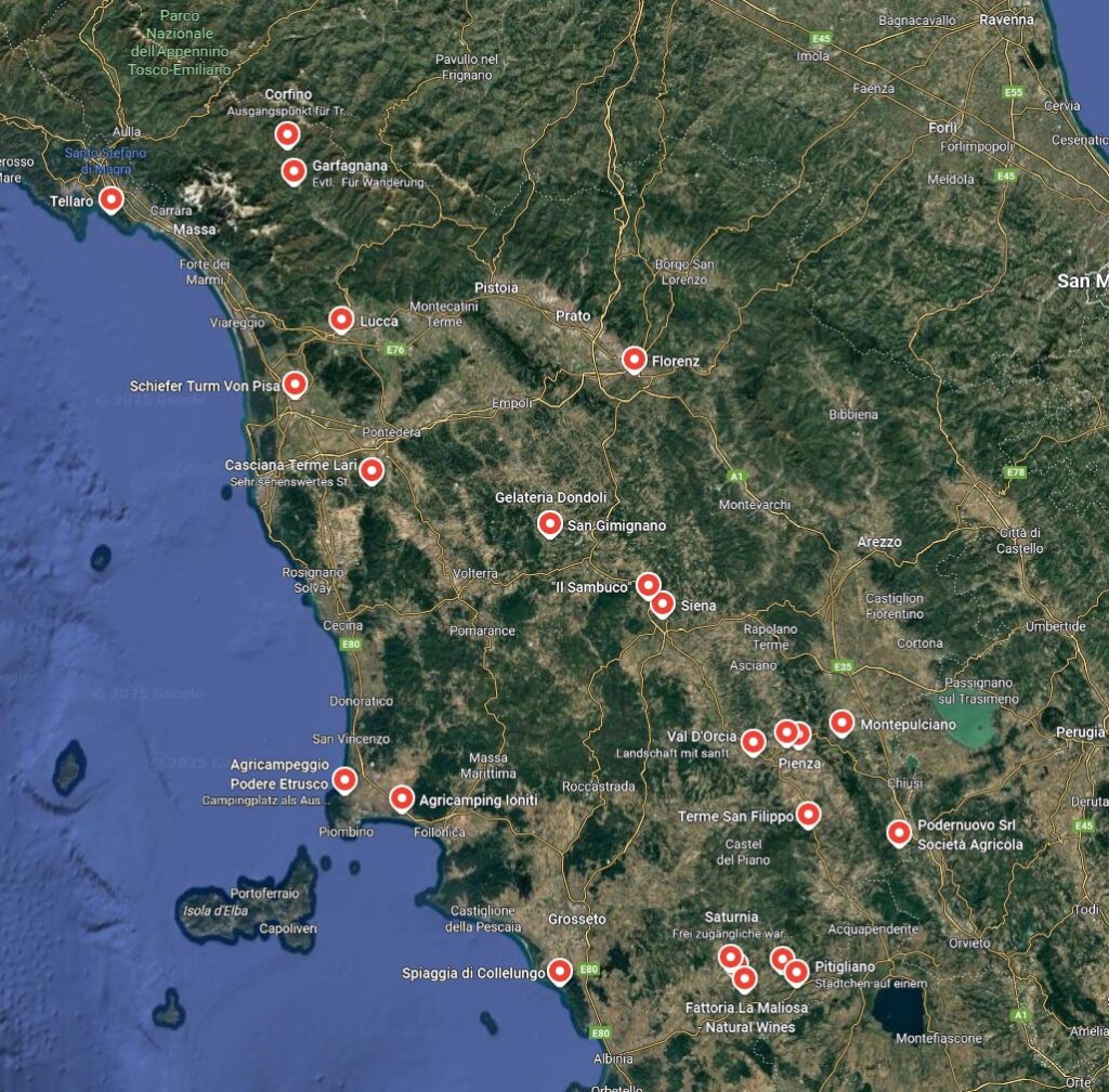 Die Schulter der Nation hat unseren Plan im Mai in die Toskana zu reisen gründlich ruiniert. Egal, Krönchen richten, Reha durchziehen, täglich trainieren und ein paar Monate später ist zumindest der Termin fix. Ende September, direkt nach dem Zwiebelmarkt, starten wir für zwei Wochen Richtung Italien. Der Reiseführer, diverse Internetblogs und Google Maps fütterte eine Liste der Orte, die wir besuchen wollen. So sieht sie als Landkarte aus: