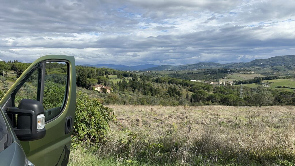 Für heute war unser Ziel ein Winzer, der im Paket Stellplatz, Weinverkostung und 3- Gänge Menü anbietet. Kurz vor Abfahrt Campingplatz in Florenz müssen wir noch unser Grauwasser entsorgen. Das junge Paar im Wohnmobil hinter uns erzählt uns, dass sie auf ein Weingut wollen mit Verkostung. In der Tat, sie haben den gleichen Plan wie wir! Die Welt ist klein.