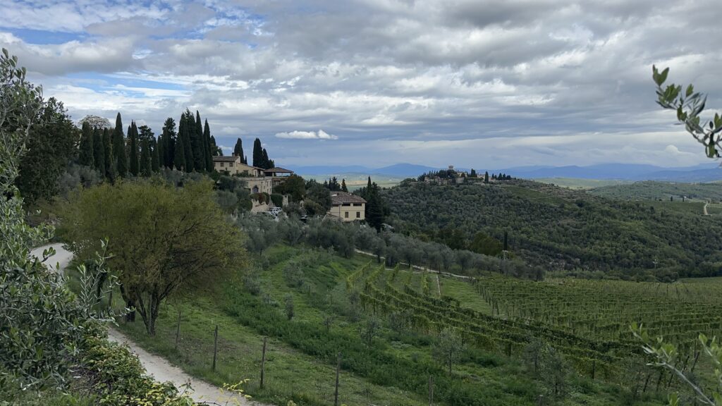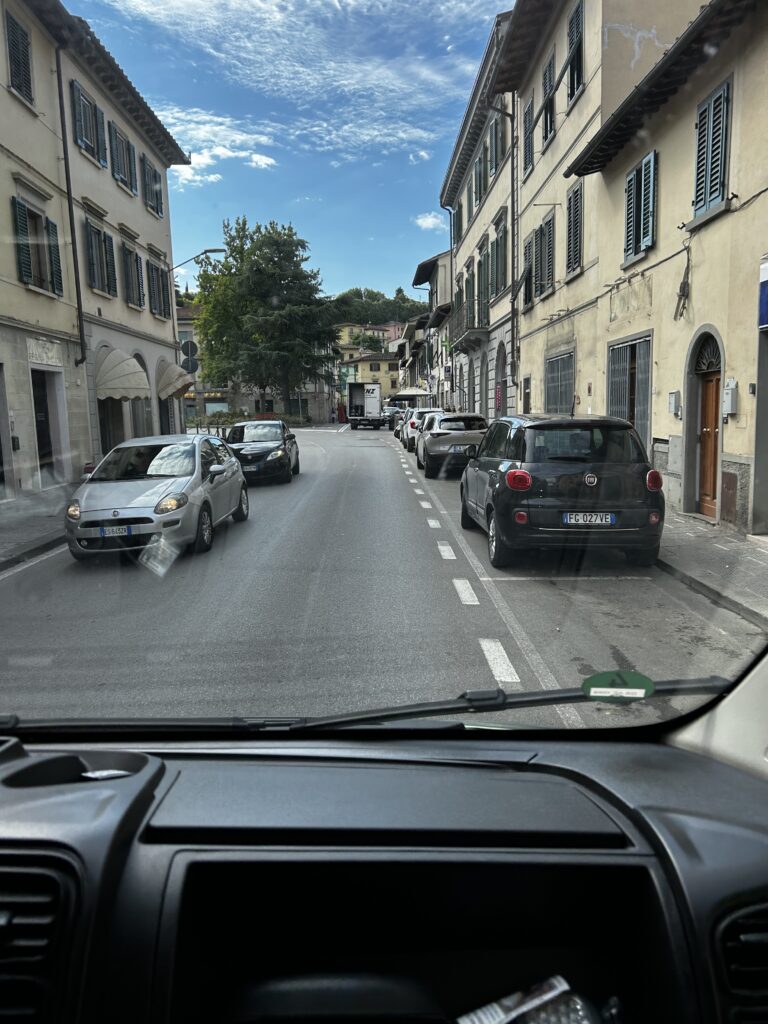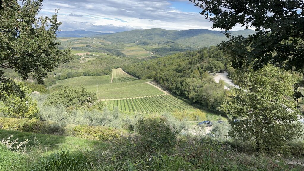 Wir wollen uns auf dem Weg zu unserem Ziel noch die Füsse vertreten und haben per Komoot eine Wanderung gefunden, die sich gut anhörte. Also, los und auf die SR222, die durch das komplette Chianti-Gebiet bis Siena führt. Die Strasse ist teilweise schon recht abenteuerlich, aber auch kleine, winklige Dörfer werden sourverän gemeistert. Frau Bewegmisch fehlt es etwas an Gelassenheit, aber es wird!