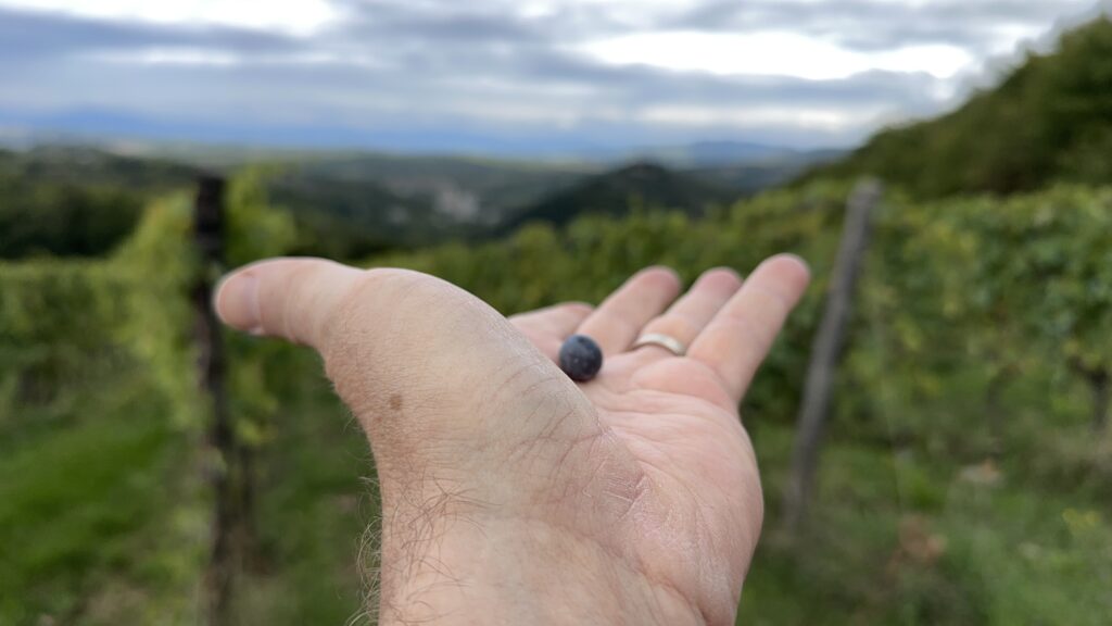 So, jetzt aber zum Weingut Clantenova, wir wollen nicht zu spät kommen. Erneut geht es über teilweise unbefestigte Wege, aber dann sind wir doch noch mit genug zeitlichem Puffer vor Ort. Stellplatz gefunden, eingeparkt und wir machen uns mit den restlichen Campern aus der Schweiz, Deutschland und Belgien bekannt. 18:00 Uhr und es geht sofort raus in die Reben.