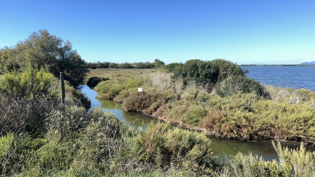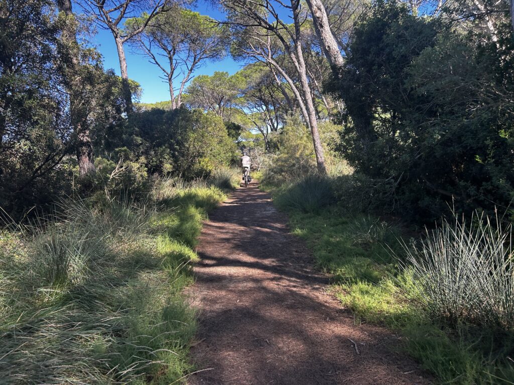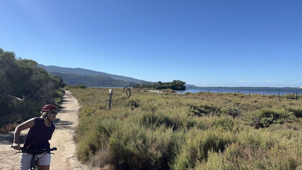 Wir vermissen unsere MTBs. Das wird uns noch mehr bewusst, weil wir am Fusse eines recht bekannten MTB-Reviers untergebracht sind. Egal, wir nutzen heute unsere Cross-Bikes, um eine kleine Runde u. a. durch ein Naturschutzgebiet zu radeln. Das Wetter lädt uns ein, 21 Grad mit knallblauem Himmel, was will man mehr. Der Weg führt uns an einer Lagune entlang