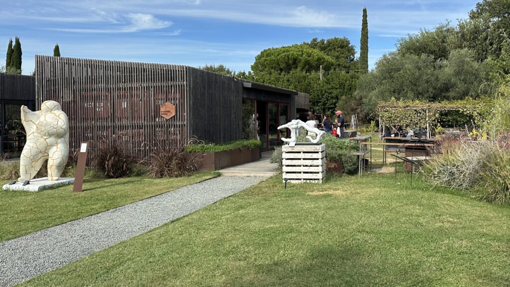 Wir verkneifen uns den Weinkonsum und gehen zurück zu den Rädern. Der Weg zurück ist deutlich angenehmer und führt an diversen Weingütern vorbei. Keines will uns so recht überzeugen, bis an einem Anwesen vorbeifahren in dem es nur so von Leuten wimmelt, die sich auf einem Gelände großzügig auf Tischen, unter Reben, auf dem Rasen verteilt haben. Die Anlage ist recht stylisch mit Kunstgebilden gestaltet. Wir lassen uns davon nicht beirren, es geht uns hier vornehmlich um den Weinkonsum. Also rein da.