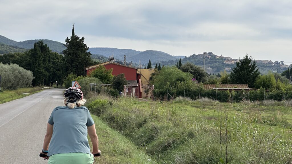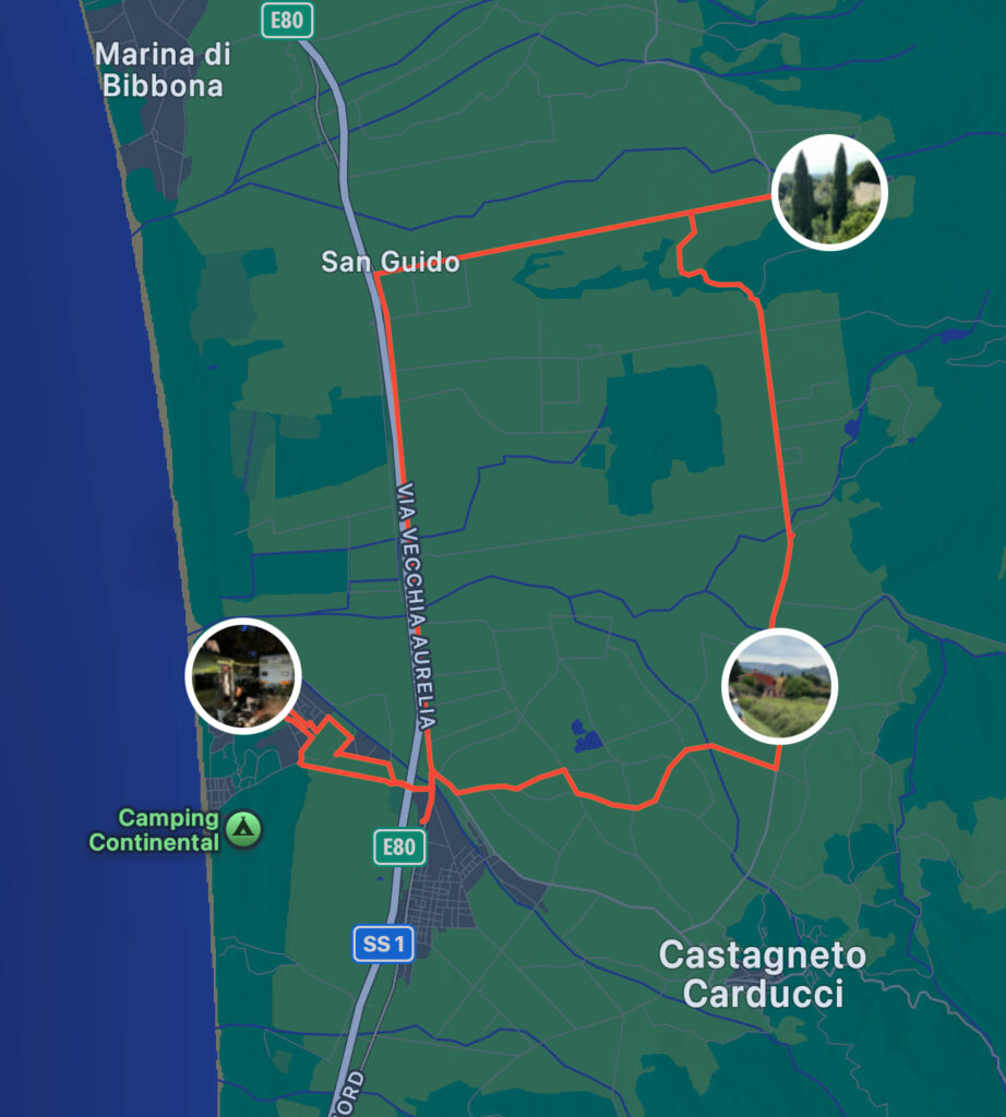 Birgit, unsere Ansprechpartnerin auf dem Campingplatz, hat uns Bolgheri empfohlen. Ein kleines Städtchen, Weinverkostungen möglich, das klang so verlockend, also los aufs Rad. Anfangs führt die Route über eine Ladesstrasse mit starkem Verkehr. Da die Italiener quasi keine Radwege kennen, teilt man sich mit dem restlichen Verkehr die Strasse. Das ist auch ein ziemlich semioptimales Vergnügen. Kurz darauf biegen wir auf eine lange Zypressen-Allee ab. Besser! Kurz darauf kommt das Dorf in Sichtweite und wir stellen die Räder am Stadttor ab.