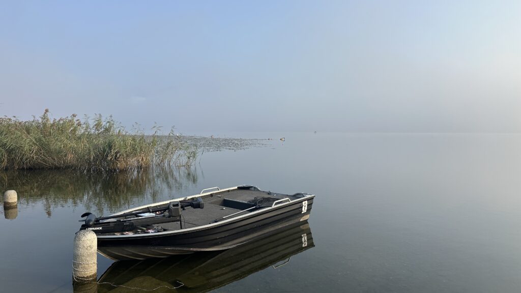 Nach dem Aufstehen laufen wir ein paar Schritte bergab zum See und ihn leider nur teilweise sehen, der Nebel verhindert einen besseren Durchblick.
